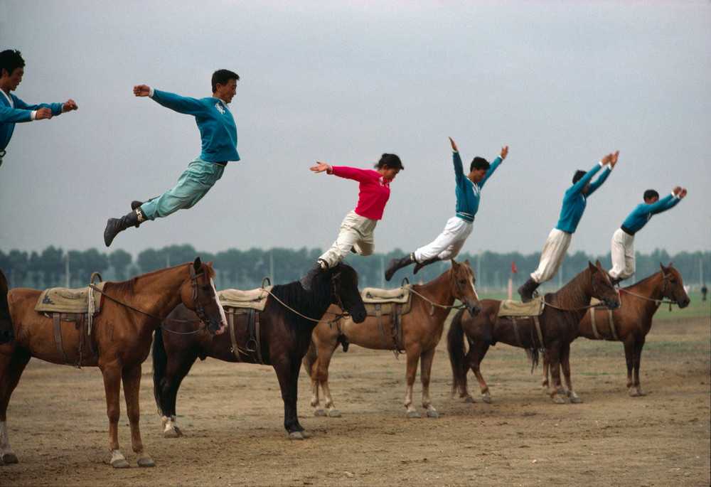 Конные акробаты на репетиции. Внутренняя Монголия, Китай, 1979.