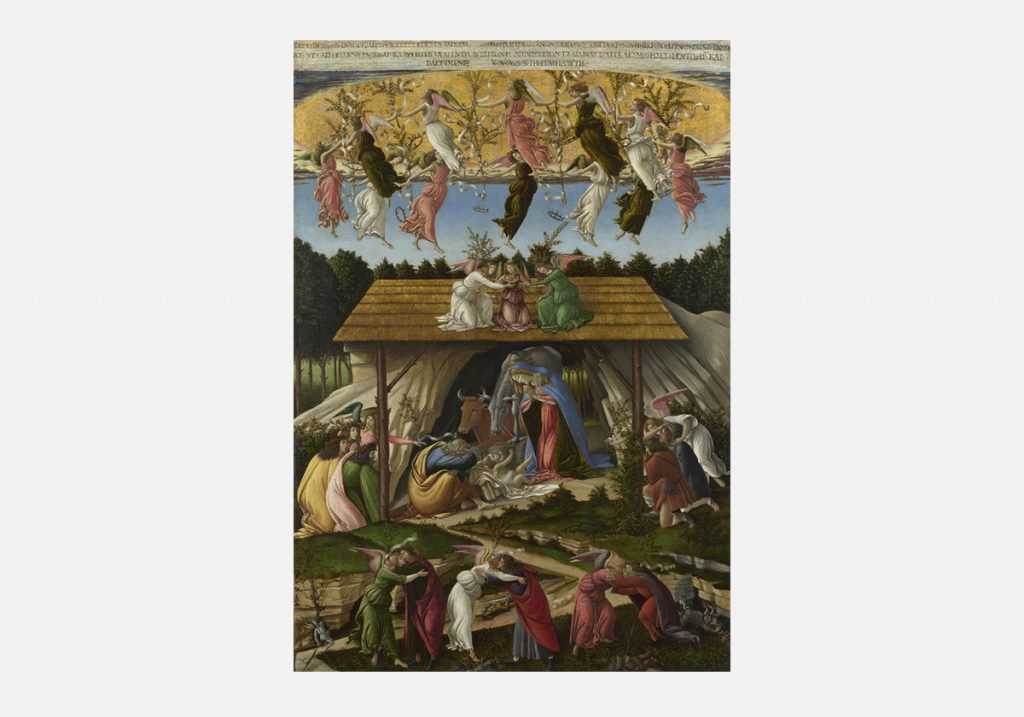 Если снова говорить о Боттичелли, то персонажи на его полотнах выписаны скорее в средневековой традиции. В «Мистическом Рождестве», как и в средневековых картинах, пространство поделено на зоны, в каждой из которых разворачивается определенный сюжет. Верхняя часть канонично написана на золотом фоне.