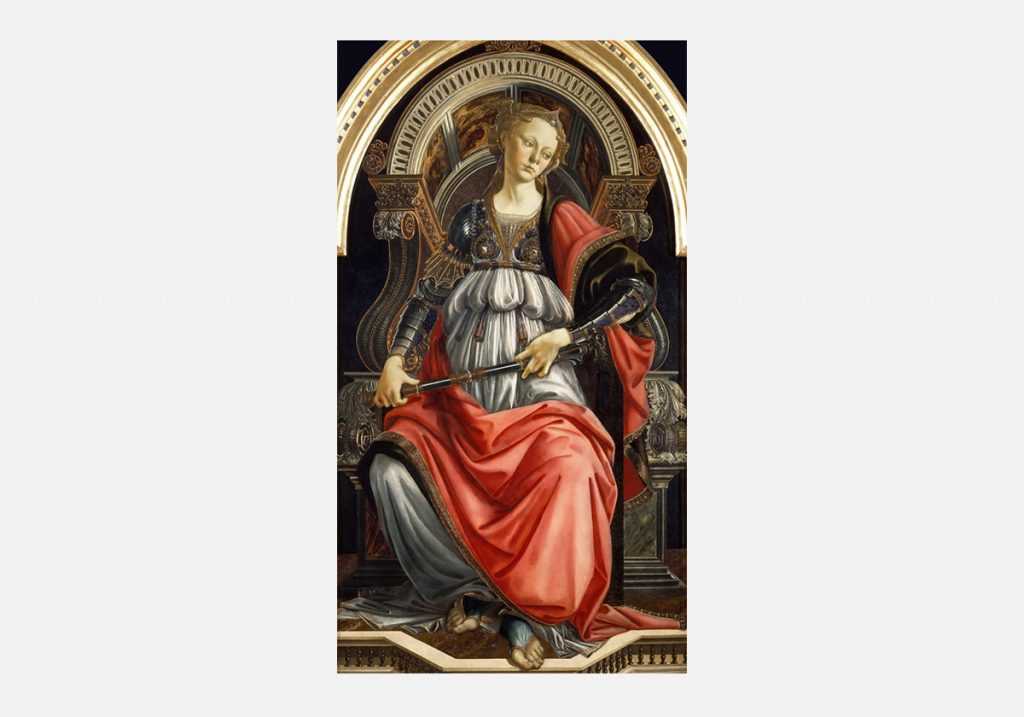 Главная героиня «Аллегории силы» тоже далека от реализма. Ее тело удлинено, маленькая голова резко контрастирует с огромными ступнями, а сама она изображена перед троном, причем довольно трудно сказать, сидит она или стоит.