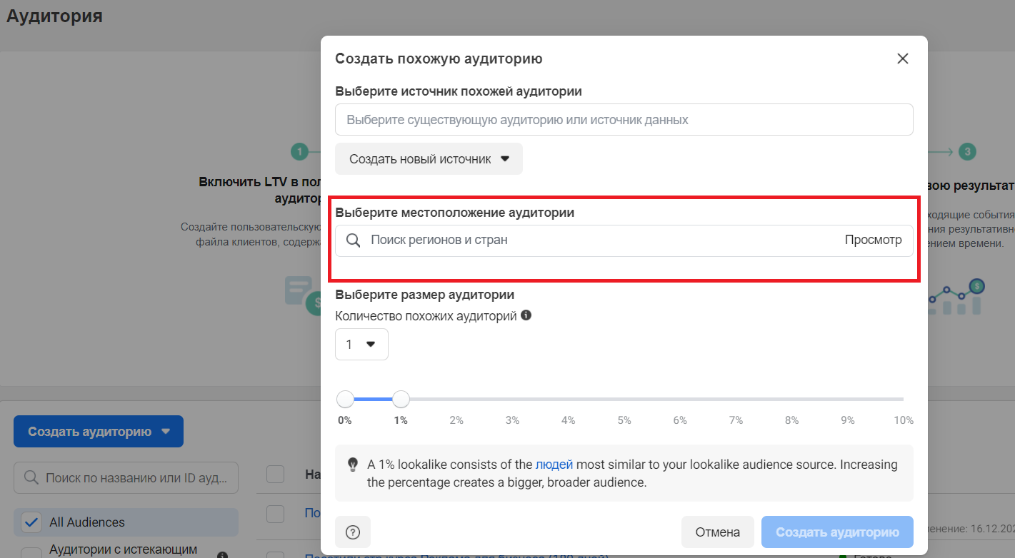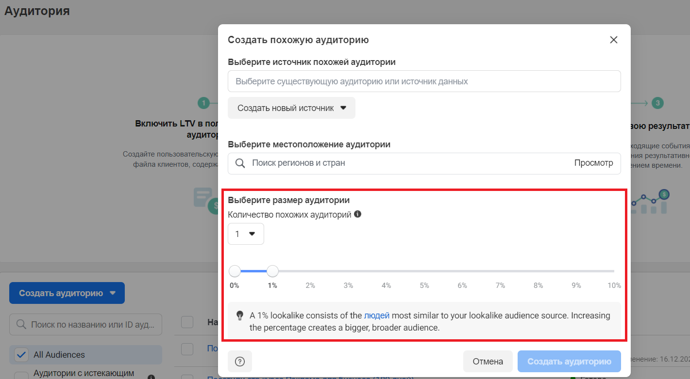 Установите размер похожей аудитории с помощью ползунка, а также определите, сколько look-alike аудиторий вы хотите создать.