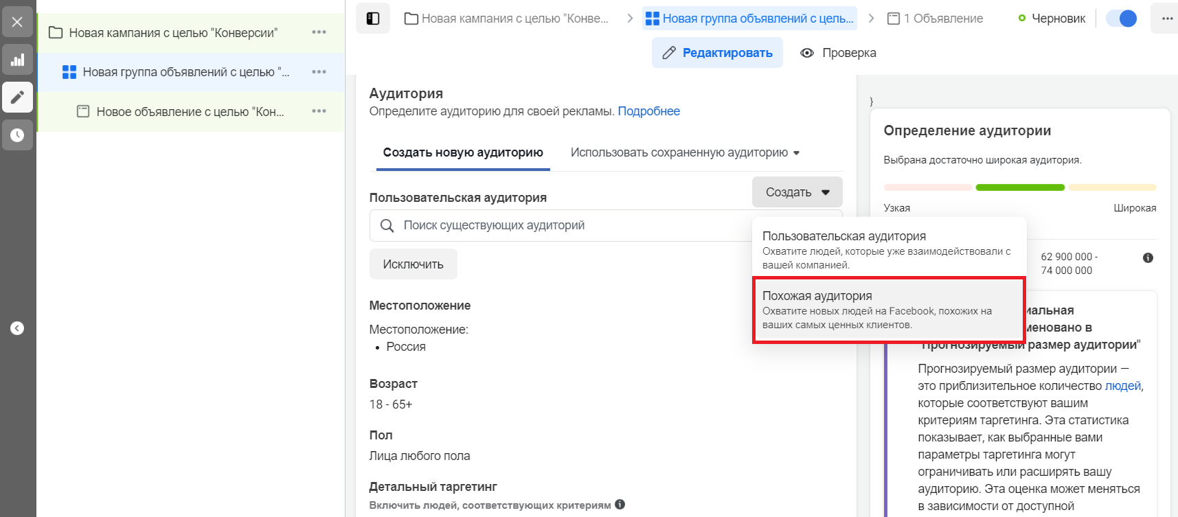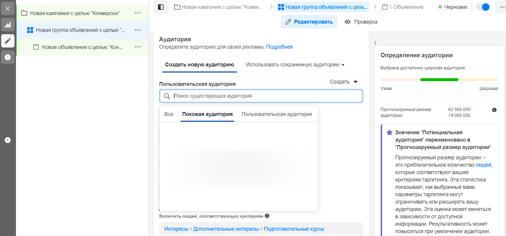 Когда данные будут собраны, аудиторию можно использовать в рекламе. Начните создавать объявление в Ads Manager и в разделе «Аудитория» нажмите «Индивид. настроенная аудитория» — «Похожая аудитория» и выберите из списка аудиторию, которую хотите использовать.