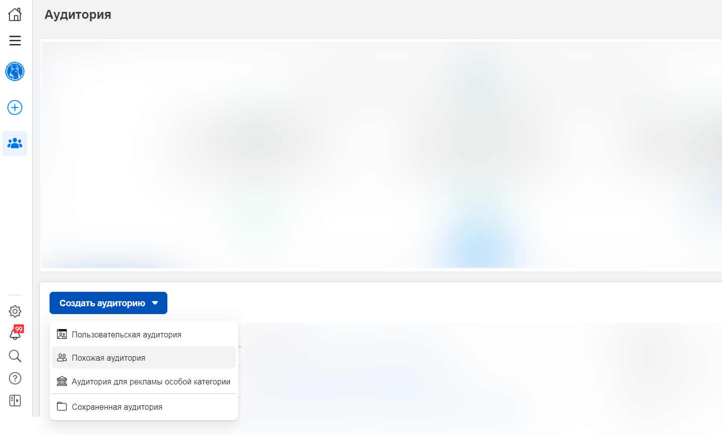 Нажмите синюю кнопку «Создать аудиторию» и выберите «Похожая аудитория».