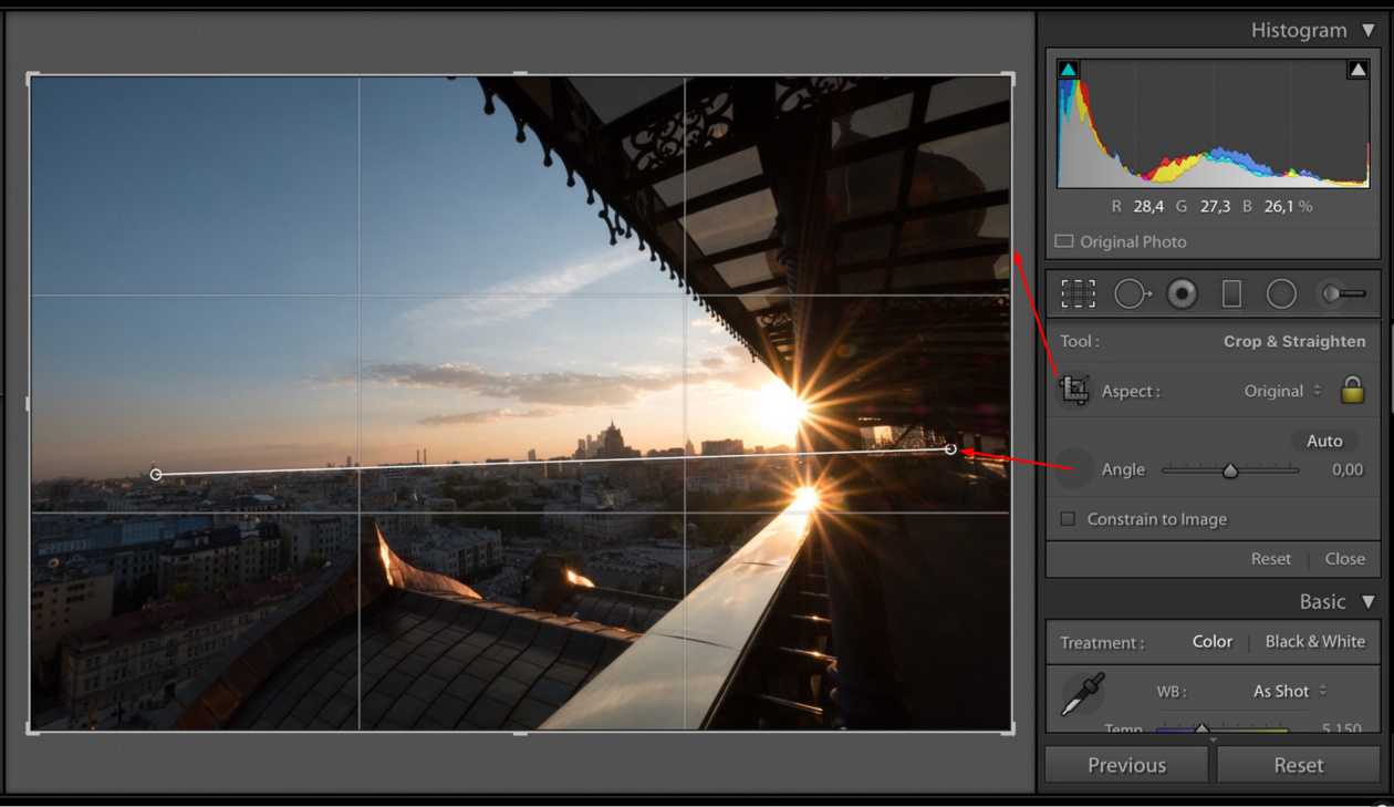 Аналогично строится работа и с вертикалями. При этом Lightroom сам поймёт, вертикаль вы хотите выровнять или горизонталь по наименьшему отклонению.