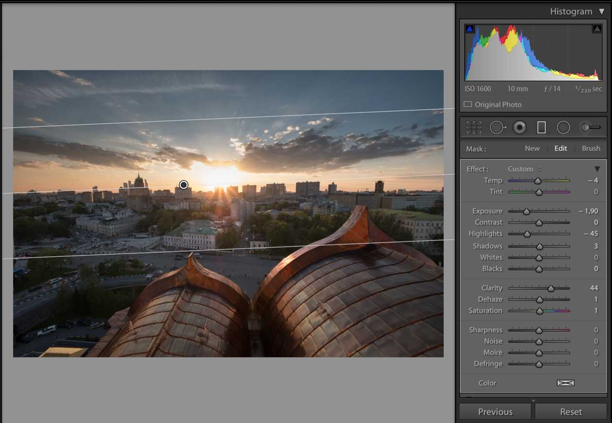 Еще одной интересной возможностью локальных инструментов является использование пресетов. Поскольку Градиентный фильтр часто используется для подчеркивания неба, то я создал пресет «Небо» настроив фильтр следующим образом: