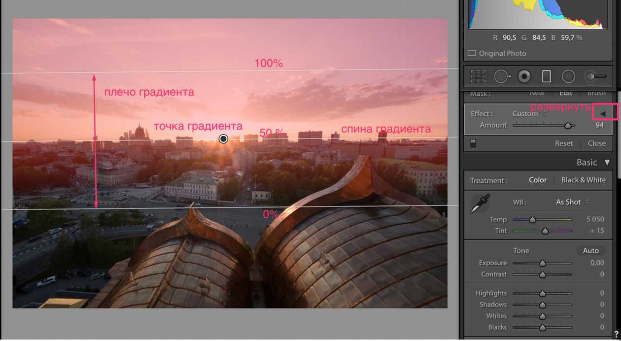 В градиенте можно регулировать те же самые параметры, которые доступны для регулировки всего изображения в блоке Basic — экспозицию, баланс белого, точки белого и чёрного.