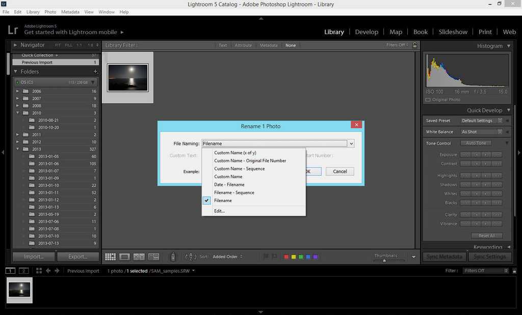 Оставшиеся фото в Лайтрум легко переименовывать в соответствии с выбранным шаблоном. Номера кадров следует проставлять в трехзначном виде, чтобы список их отражался корректно. Для получения диалогового окна переименования следует воспользоваться клавишей F2.