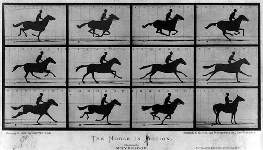 В 1878-м году, чтобы сфотографировать кобылу Салли Гарднер, нанятый Стенфордом фотограф Эдвард Майбридж установил 24 камеры, которые щёлкали затворами при каждом движении копыт лошади, на которой скакал жокей со скоростью 57 км в час. Результатом стала широко известная серия снимков. Кроме того, Майбридж изобрёл зоопраксископ – аппарат, позволяющий сделать последовательные фото, которые при склейке превращаются в небольшой фильм. Обладая этими знаниями, он, наконец, смог ответить на волнующий вопрос: в процессе галопа все четыре копыта лошади одновременно оказывались в воздухе.