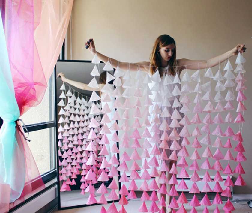 Для изготовления потребуются: атласная лента (от 10 метров), пергаментная бумага, игла с ниткой, ножницы и клей. На первом шаге вырезаются бумажные полукруги. Затем они сворачиваются конусом и закрепляются клеем. После чего готовые заготовки нанизываются на нить на расстоянии около двух сантиметров друг от друга.