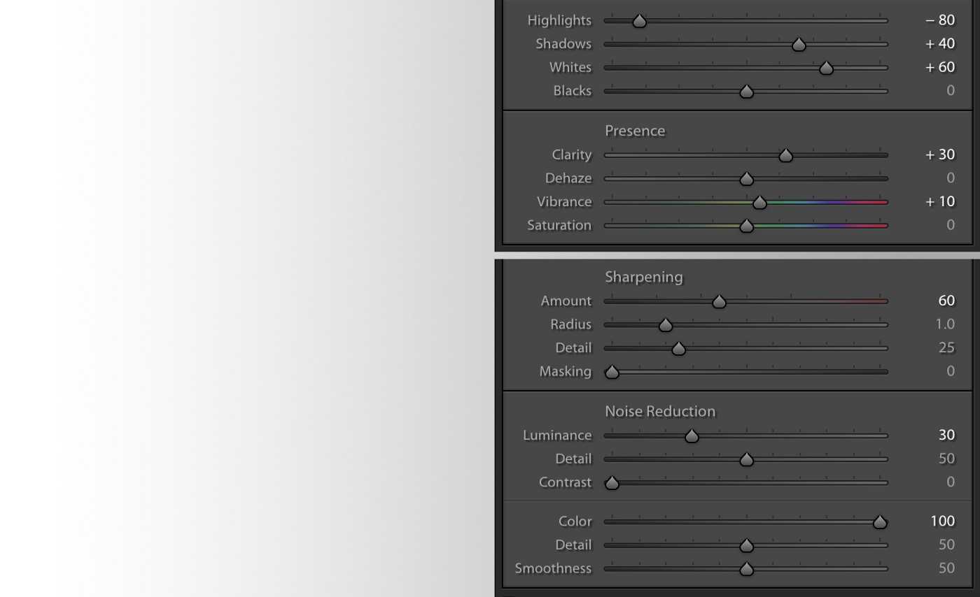 Раздел Basic (Основной):Highlights (Света) -80Shadows (Тени) +40Whites (Белые) +60Clarity (Чёткость) +30Vibrance (Сочность) +10