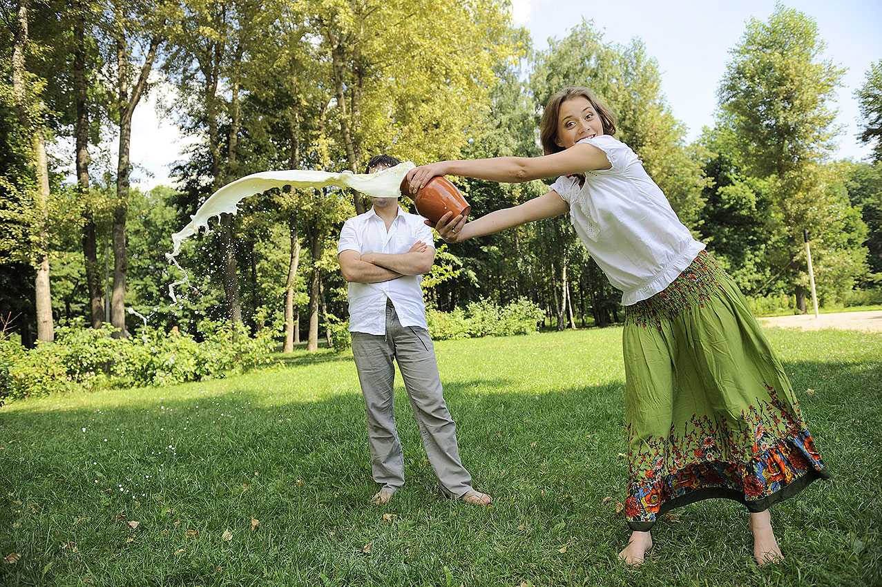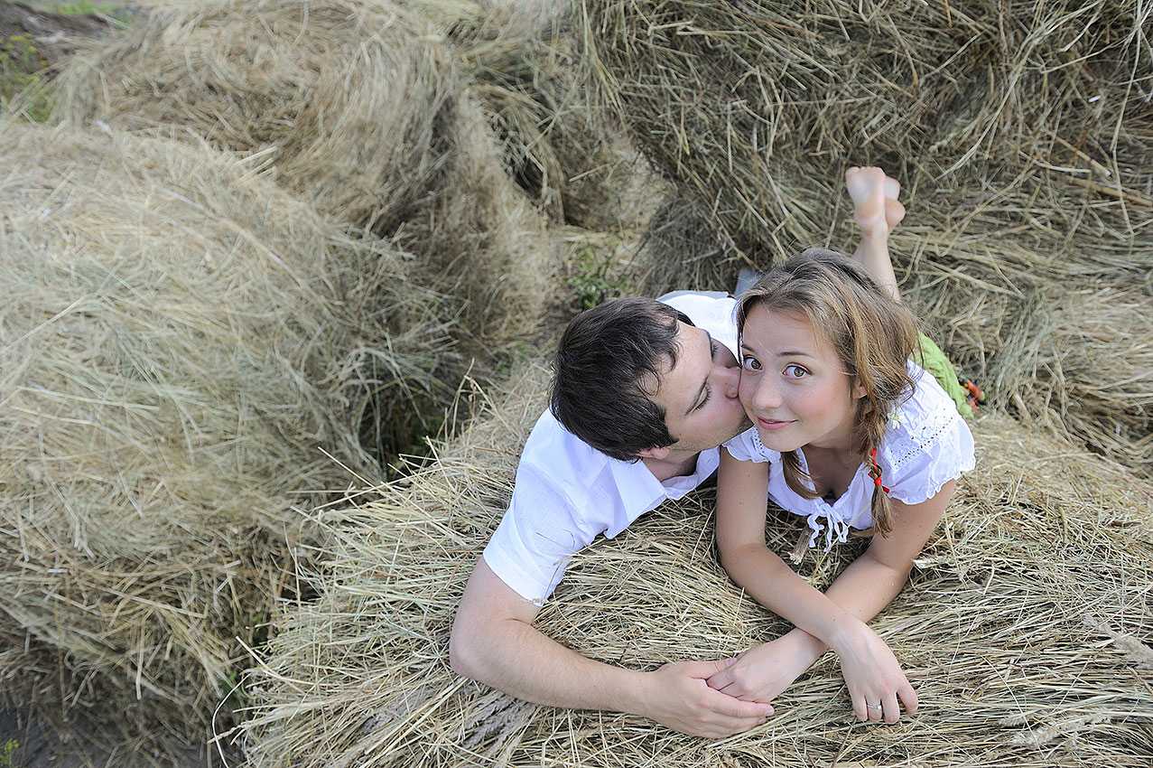Можно сделать фотосессию в поле, среди золотистых колосков. Красиво смотрятся снимки, на которых влюбленные бегут по полю, взявшись за руки. В качестве реквизита можно сделать букет из колосков и обмотать его яркой ленточкой.