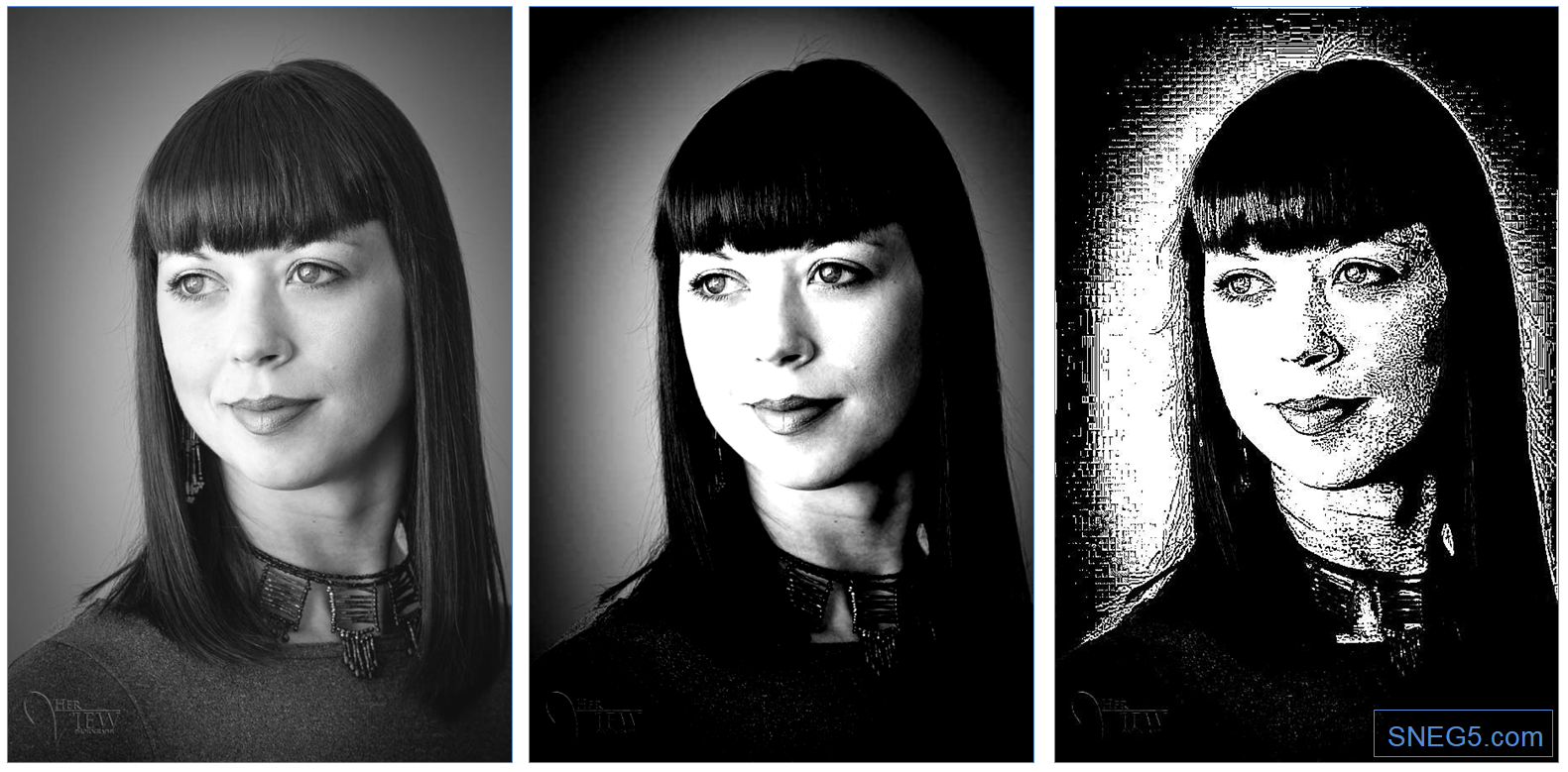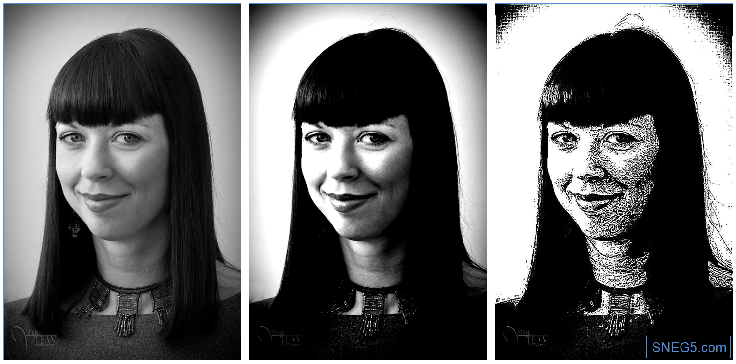 Свет Рембрандта (Rembrandt Lighting). Первое фото — исходное. На втором фото контрастность увеличена на 50%. третье фото переведено в штриховое. │ Иллюстрация SNEG5.com