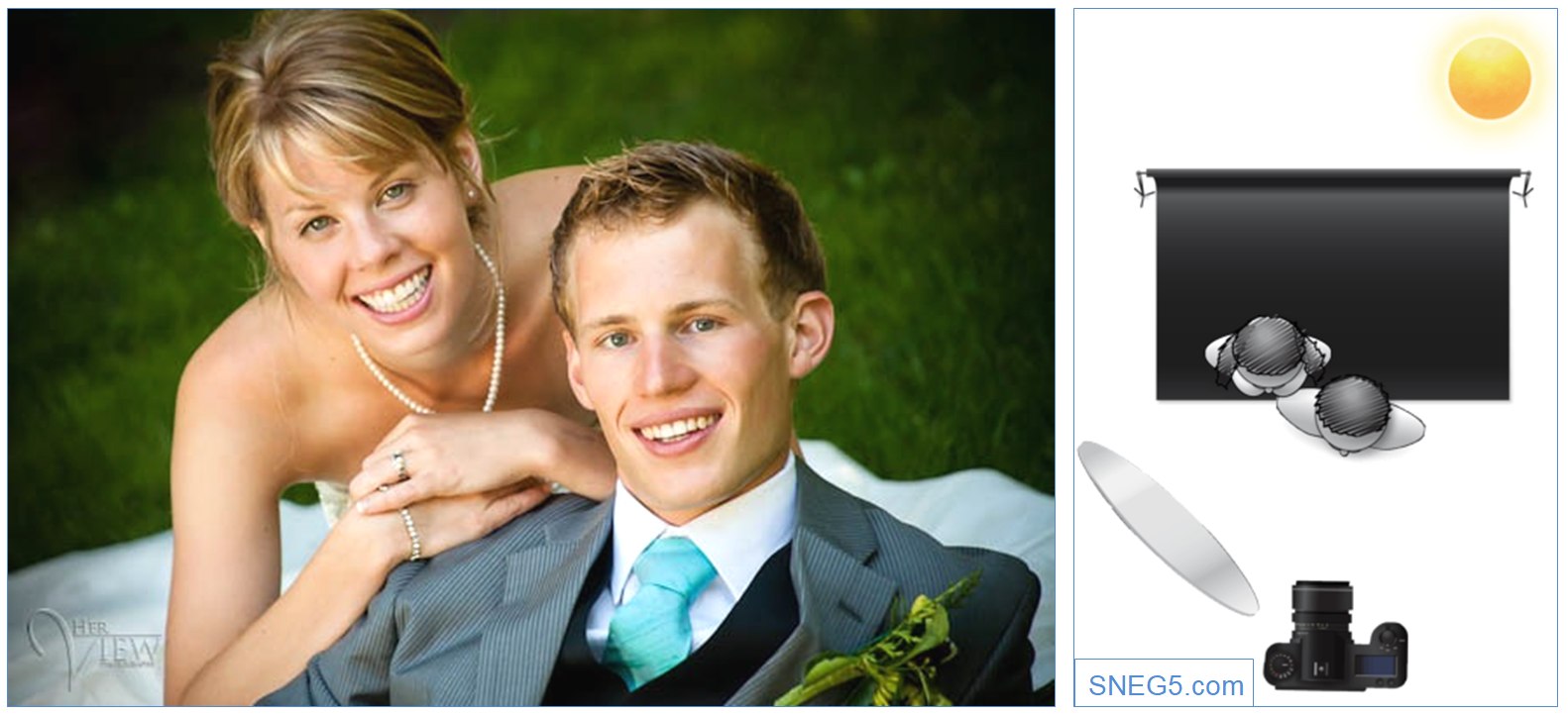 На этой схеме освещения типа «Петля» черный фон – это деревья на фоне моделей. Солнце светит из-за деревьев, но зелень находится в тени. Слева от камеры установлен белый лайт-диск, который отражает свет на лица молодоженов.