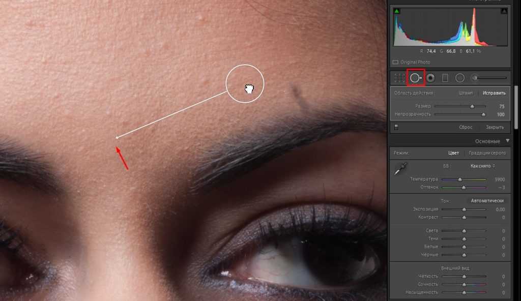 Итак, на коже пытаемся отыскать дефекты, и если удается, удаляем их инструментом spot removal в режиме heal. Можно убрать на время круги нажатием на клавишу H, чтобы было удобнее оценить результат.