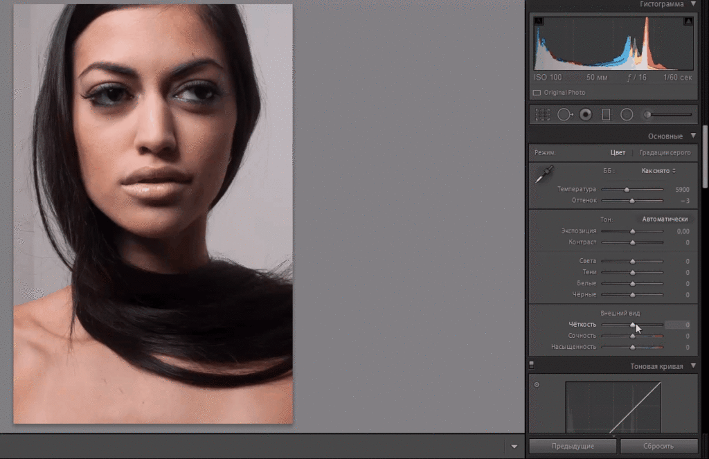 Если у модели кожа такая же, как у меня на фото, а именно очень структурная (резкий свет, крупные поры на коже, и тд), то для того чтобы смягчить кожу, можно использовать ползунок «Четкость».
