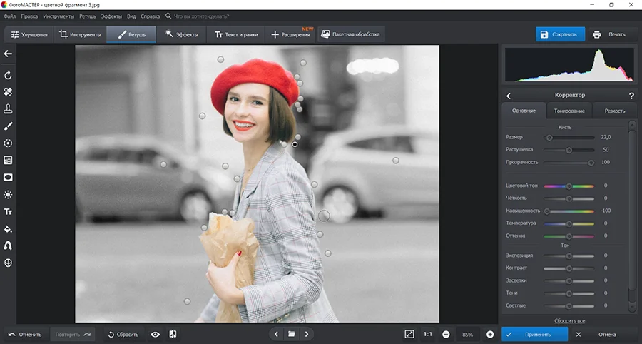 3 способ. Если вы хотите сохранить отдельные элементы цветными, то можно выполнить точечное редактирование. Для этого в разделе «Ретушь» воспользуйтесь инструментом «Корректор». Установите насыщенность на -100 и отрегулируйте размер и степень растушевки кисти. Закрасьте области, которые необходимо обесцветить. При выделении участок будет отображаться белым цветом.