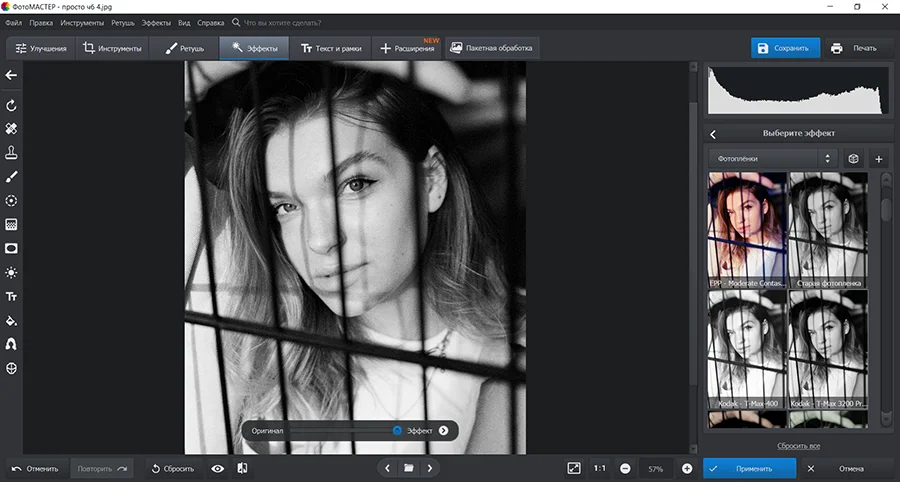 2 способ. Воспользуйтесь эффектами из встроенной коллекции. Помимо перевода фотографии фильтр настроит освещение и контраст данных. Для наложения пресета перейдите во вкладку «Эффекты» — «Каталог эффектов». Чб-фильтры представлены в категориях «Популярные», «Фотопленки» и «Кинофильмы». Просто кликните на подходящий вариант и щелкните «Применить».
