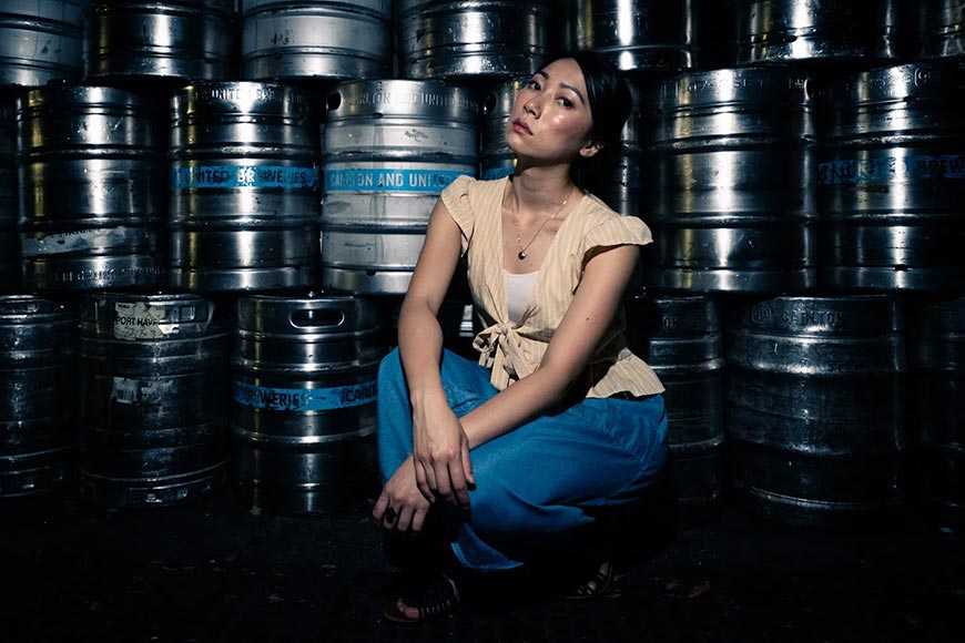 Энн перед пивными бочонками, Брисбен. Мне нравится форма, цвет и отражение бочонков на заднем плане. Fujifilm X-T3 с объективом 8-16 мм f2.8, освещенным светодиодной подсветкой.