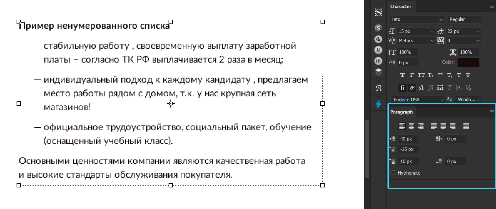 Обратите внимание на хитрые отступы в панели Paragraph. Они позволяют сохранять единый отступ пунктов списка по отношению к буллетам