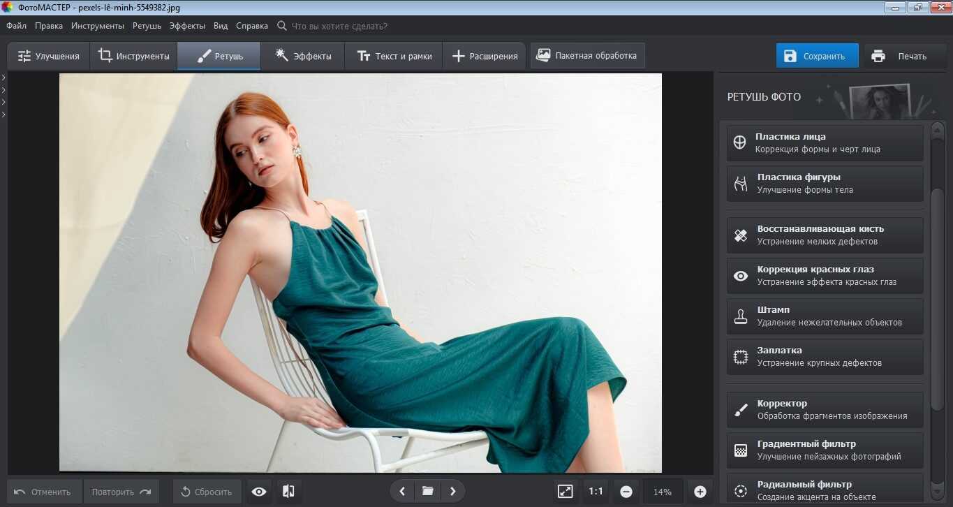 Профессионалы могут загружать в программу «сырые» RAW-файлы и обрабатывать их, в том числе с помощью кривых. В ФотоМАСТЕРе есть хороший корректор, чтобы менять тона локальных областей и объектов. Также в редакторе есть функция вставки картинок поверх исходного изображения. Благодаря ей можно добавлять авторские логотипы, как в Photoshop, и создавать коллажи. С помощью градиентного фильтра можно преображать пейзажные кадры, а радиальным фильтром создавать эффект боке. Для обработки портретов в приложение встроены мощные модули пластики тела и лица.
