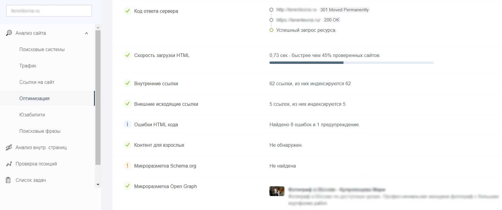 Фрагмент проверки сайта
