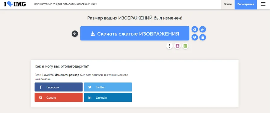 Кликните «Изменить размер изображений». Если вы работали с несколькими изображениями, они сохранятся в виде архиве RAR. Также вы можете отправить медиафайлы в облачные хранилища или создать ссылку.