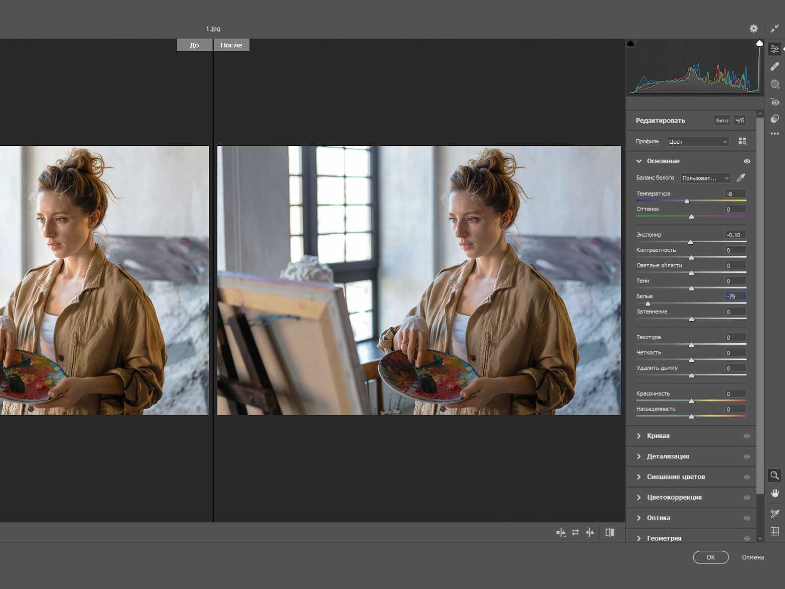Настройки позволяют убрать чистый белый свет, пересветы и недосветы. С той же целью можно редактировать «Светлые области», но мы оставили их на 0, потому что параметров «Экспозиция» (−0,10) и «Белые» (−79) оказалось достаточно: