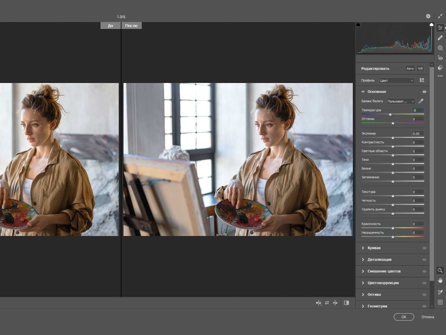 Эти настройки редактируют баланс белого, чтобы нужные цвета стали нейтральными или наоборот. В нашем случае мы смогли добиться эффекта наложения лёгкого холодного оттенка на фотографию, лишь немного сдвинув температуру влево (−8) и не меняя оттенок. Чтобы изменить изображение в нужную сторону, необязательно выкручивать настройки на максимум: