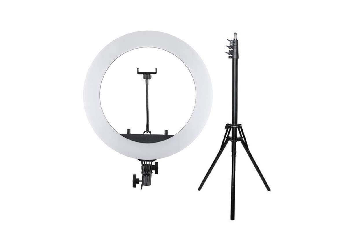 Кольцевая лампа с мощностью 55 Вт одинаково хорошо подходит визажистам, блогерам, фотографам и парикмахерам. Включает в себя 240 отдельных диодов. Комплектуется штативом, сетевым адаптером и держателем для фотоаппарата и смартфона.
