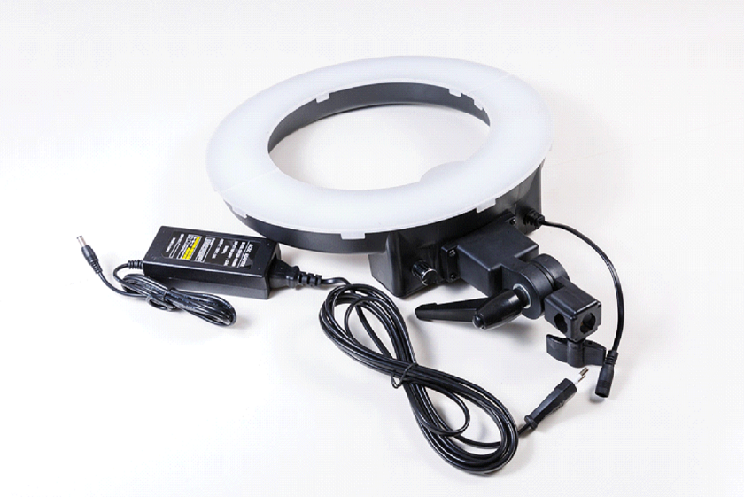 Лампа для блоггеров с регулировкой яркости состоит из 180 диодов с цветовой температурой 5500 К. Диаметр приспособления составляет 34,5 см, модель подходит, в том числе для студийного использования.