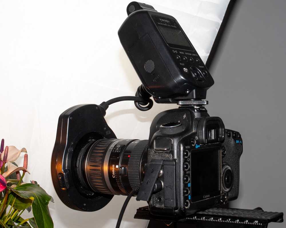В случае EF-S или других специальных объективов с датчиком кадрирования, которые невозможно физически установить на полнокадровые камеры, вы можете использовать удлинительную трубку для преодоления монтажного барьера. В приведенном ниже примере я использовал 36-миллиметровую трубку Kenko, чтобы адаптировать объектив EF-S к корпусу Canon 5DII.