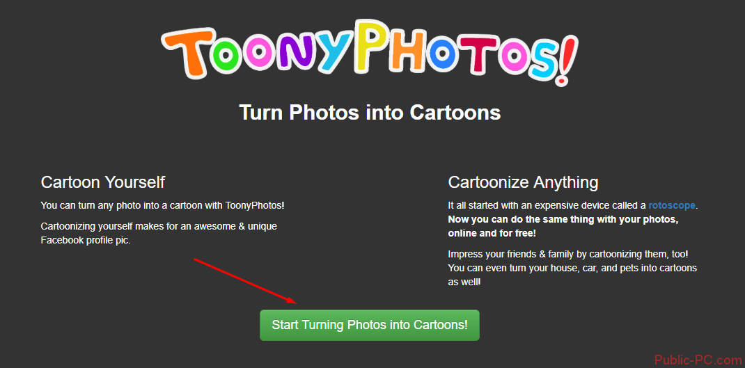 Теперь пойдем по англоязычным сервисам. Первый из них – Toony Photos. Заходим на сайт и кликаем зеленую иконку старта.