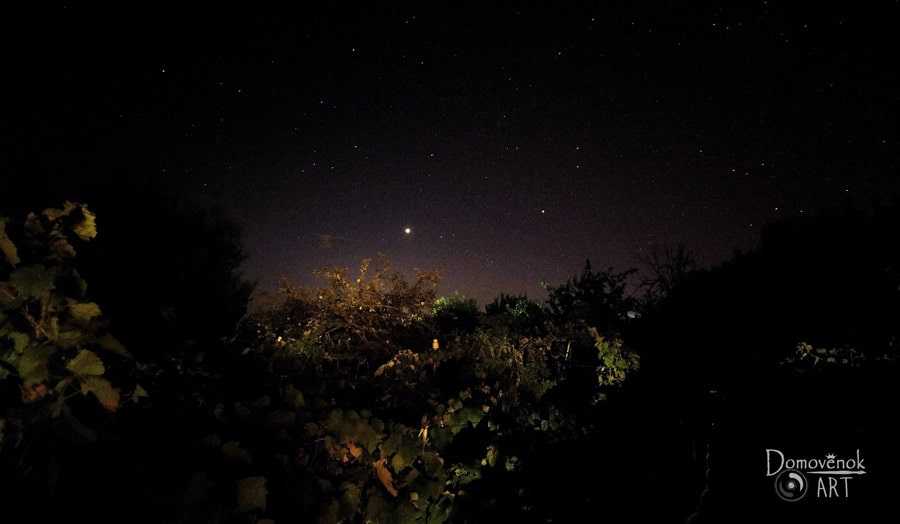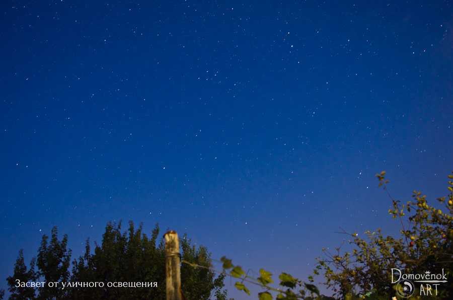 Главная проблема такой съемки — при небольших выдержках звезды не видны, а при больших — они уже выглядят не четкими точками, а размазанными. Поэтому начинайте с выдержки секунд 10 — если кадр слишком темный, и звезд не видно, увеличивайте выдержку на 3-5 сек.