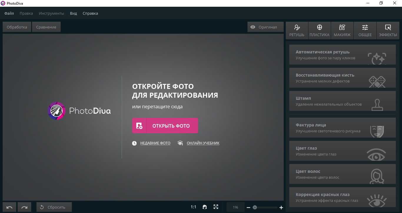 Фоторедактор PhotoDiva разработан специально для косметической ретуши портретов. В нем можно скорректировать черты лица, наложить макияж, легко понять, как изменить цвет глаз на фото. В том числе программа позволяет примерить новый оттенок для ваших прядей.