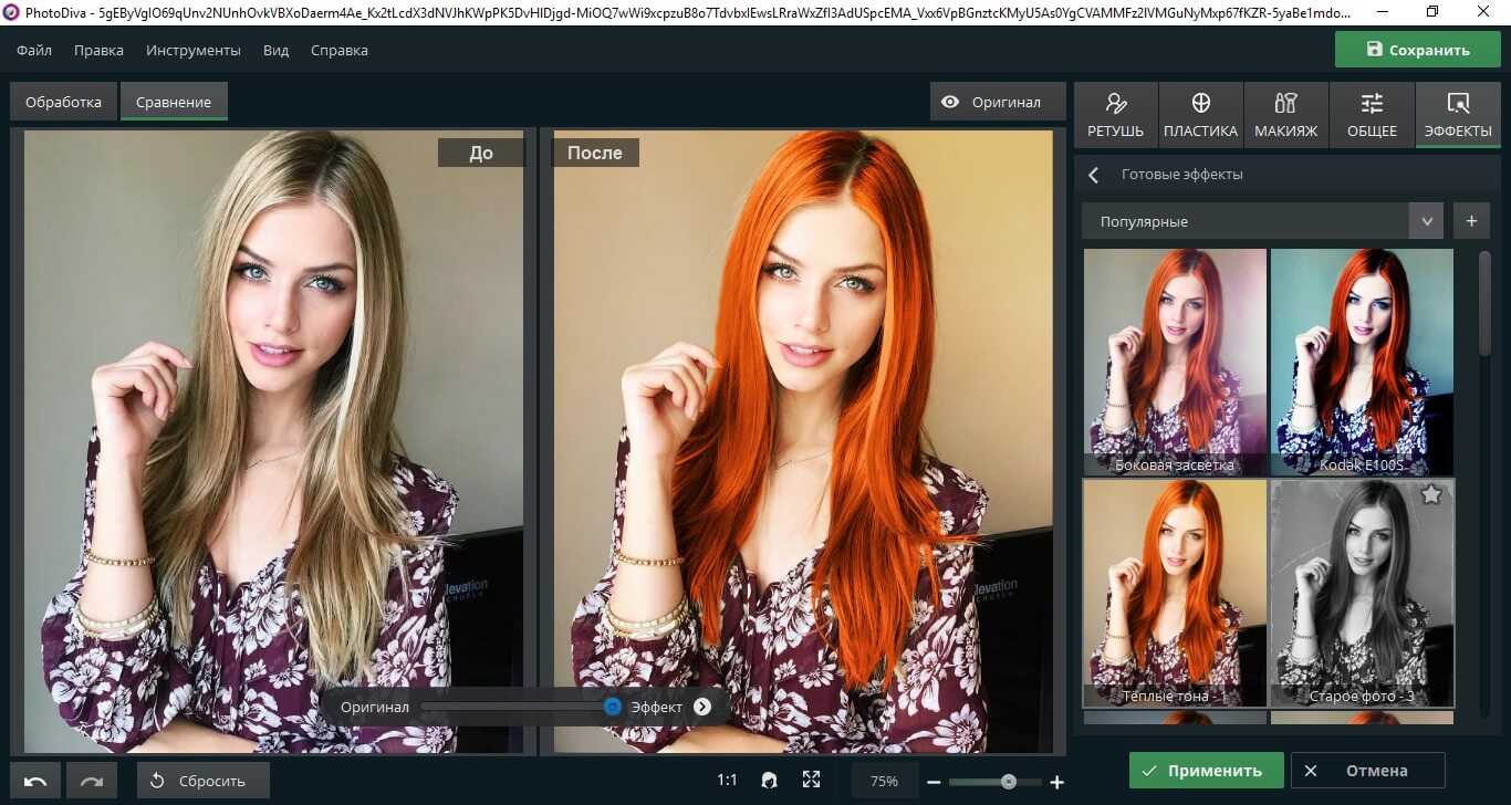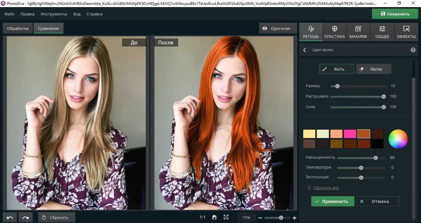 PhotoDiva – самая удобная программа, которая меняет цвет волос. Она создает натуральный эффект окрашивания, ей удобно и быстро пользоваться. В приложении можно легко научиться тому, как убрать мешки под глазами на фотографии, наложить виртуальный макияж, изменить черты лица, убрать косметические дефекты и многое другое. Скачайте редактор и с легкостью ретушируйте свои селфи на профессиональном уровне, создавайте снимки, достойные тысяч лайков.
