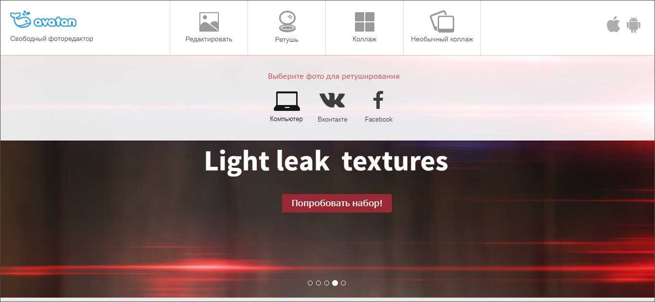 1. Перейдите на сайт и в главном меню выберите пункт «Ретушь». Загрузите фото.