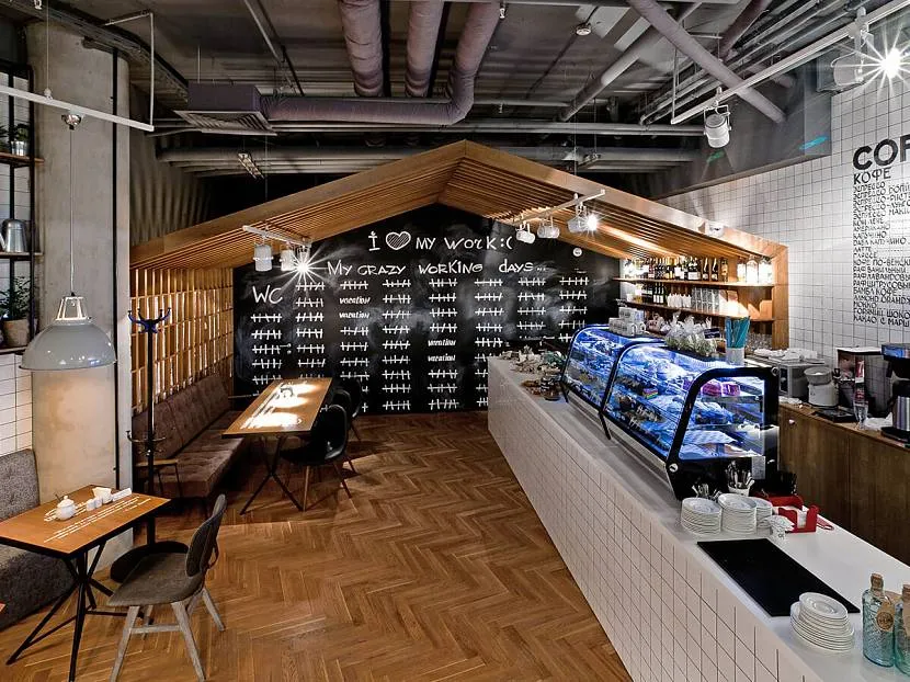 Вентиляционные трубы на потолке служат дополнительным декором в оформлении современной кофейни