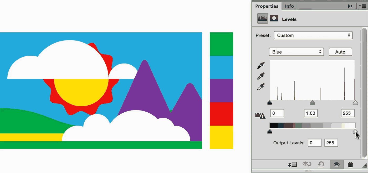 К примеру, если мы находимся в синем канале и подвинем слайдер теней (черный) вправо, мы добавим некоторую долю синего в черные цвета. Таким образом, все изображение (за исключением чисто белых областей) наполнится синим. Это повлияет на степень “темноты” самых темных частей нашего изображения.