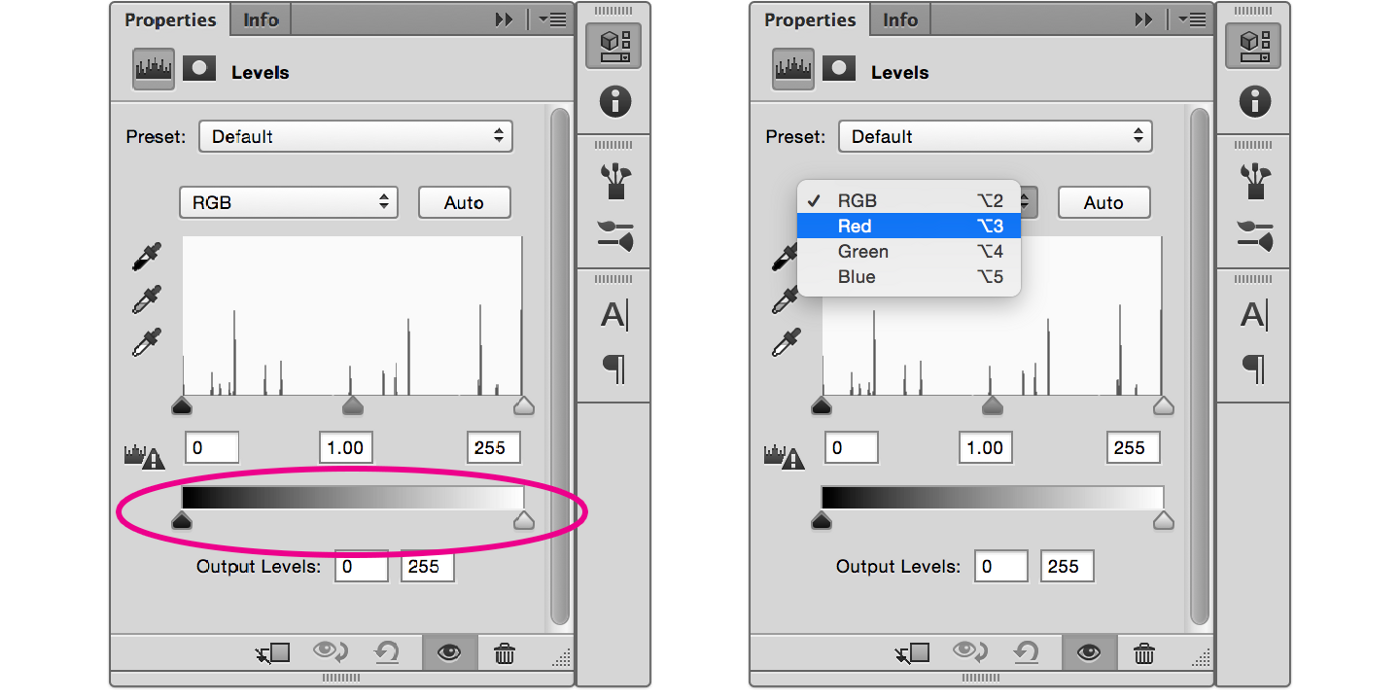Розовым овалом показано, где находятся 2 слайдера (которые меняют — слева направо — показатели теней и светов), которыми мы будем сегодня пользоваться. Опять же, это далеко не все, что можно делать с уровнями — лишь некоторые важные моменты для начала.