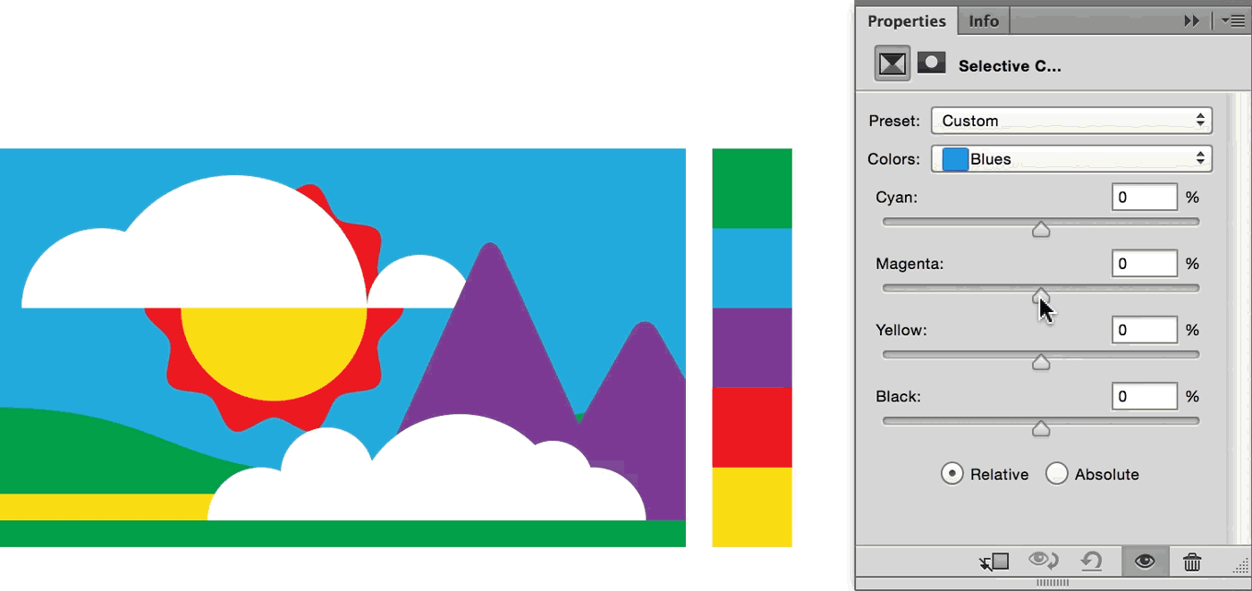 - H – тон. Влияет на цветовой тон определенного цвета. Например, если вы сдвинете синий ползунок влево, синий цвет на изображении постепенно станет более зеленоватым. Сдвиньте его вправо, и цвет станет более пурпурным.