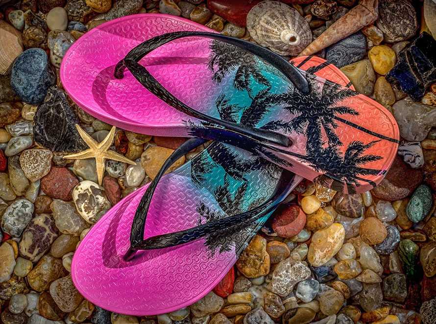 Используя мою коллекцию ракушек и камней, а также сандалий моей жены, я смог сделать этот снимок, похожий на коммерческую фотографию продукта