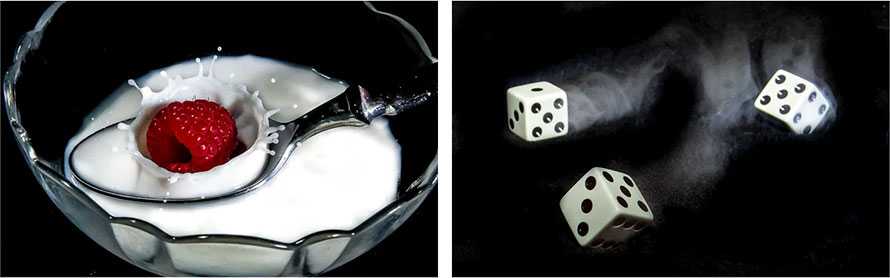 Кто сказал, что фотографии натюрморта должны быть статичные? «Брызги от малины в молоке» я заморозил движение с помощью короткого импульса вспышки, Canon 50D, объектива Tamron 17-50, 1/60 f / 25, ISO 100. «Падающие кости» снимок с более длинной выдержкой снятый со вспышкой с синхронизацией по второй шторке, Canon 50D, объектив Canon 17-40, 1,0 с f / 13 ISO 100