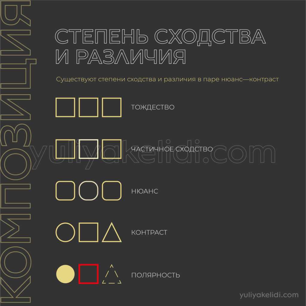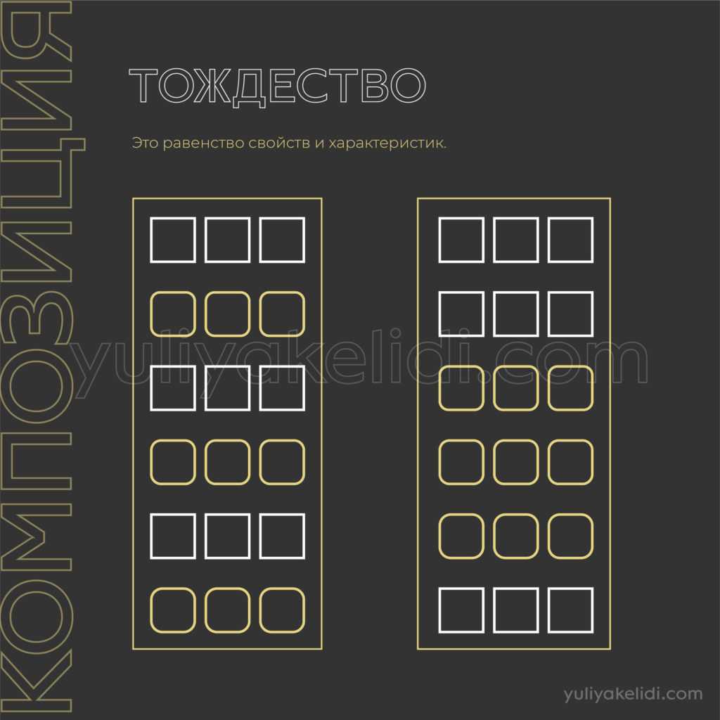 - Тождество. Элементы аналогичны по всем композиционным свойствам — по цвету, по размеру и т.д.