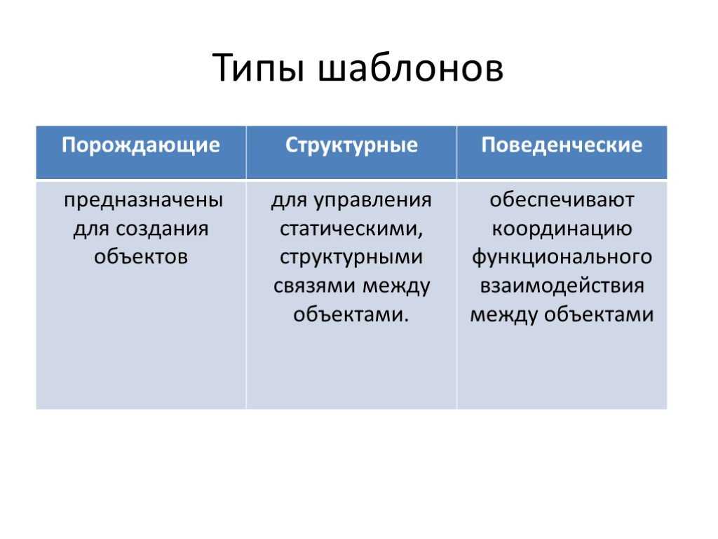 Сегодня существует очень много разных паттернов. Они решают различные вопросы, выполняют разные задачи. И действует они по-разному, поэтому их можно классифицировать по группам. В основе такой классификации и объединения в группы будут лежать поставленные цели и решаемые задачи.