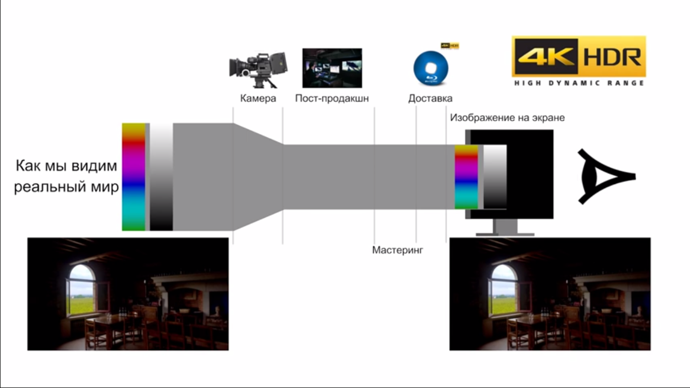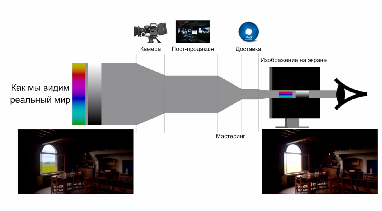 Понять значение этого показателя для видеофайлов можно на примере того, как изображение из реального мира попадает на наши экраны, создавая стандарт SDR (cтандартный динамический диапазон).