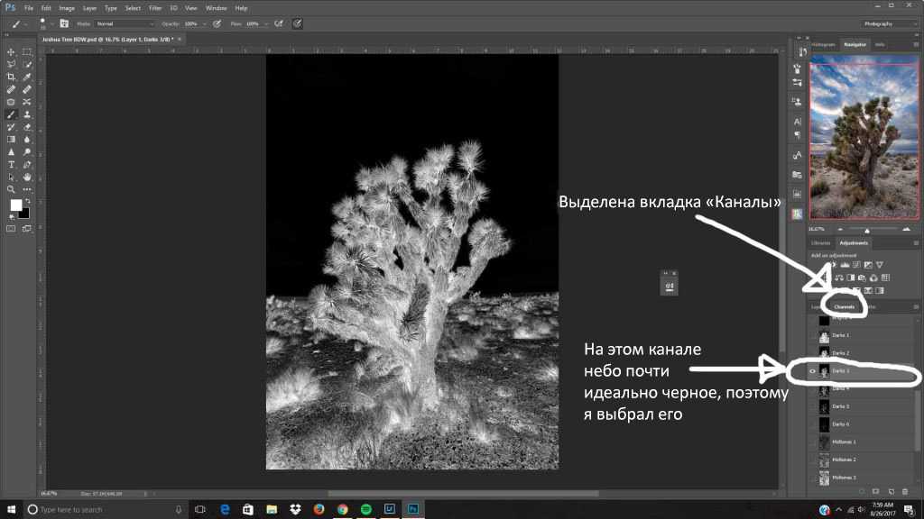 Маски свечения находятся на вкладке Каналы (Channels) рядом со вкладкой Слои (Layers) в боковой панели. Активируйте ее и увидите, что появилось множество масок свечения. Теперь пройдитесь по слоям и найдите тот, земля или небо на котором практически одного цвета (черного и белого).