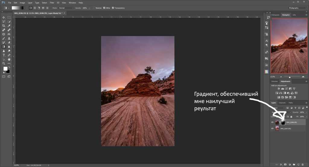 Совет: После того как вы наложите градиент и получите снимок, воспользуйтесь кистью, чтобы подправить маску. Выберите белый или черный цвет и измените непрозрачность. Начать можно с 25%. Однако, одного оптимального числа нет. Просто ориентируйтесь на ситуацию и поправьте нужные участки.