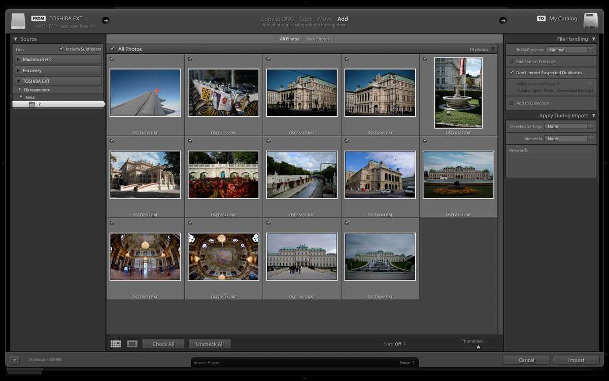 В центре окна вы увидите все фотографии и видео находящиеся в выбранных папках. Если не хотите импортировать в Lightroom отдельные фото фотографии уберите с них галки. Кликнув два раза на фото можно её увеличить.