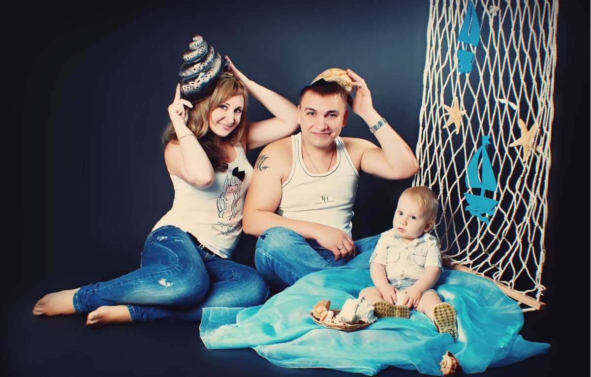 Фотосессия с ребенком может получиться веселой, если сделать его главным героем во всей студии. Он может в шутку обвязать родителей гирляндами, измазать всех в сладком торте. Младенца нарядите в смешной костюм, который явно ему не по размеру или примерьте ему большие очки.