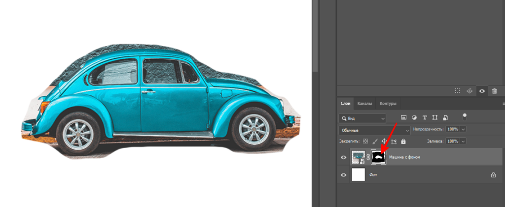 К слою добавится маска, но визуально на картинке ничего не изменится, так как маска невидимая. Возле слоя с машиной на нашем примере появился белый квадрат — это маска.