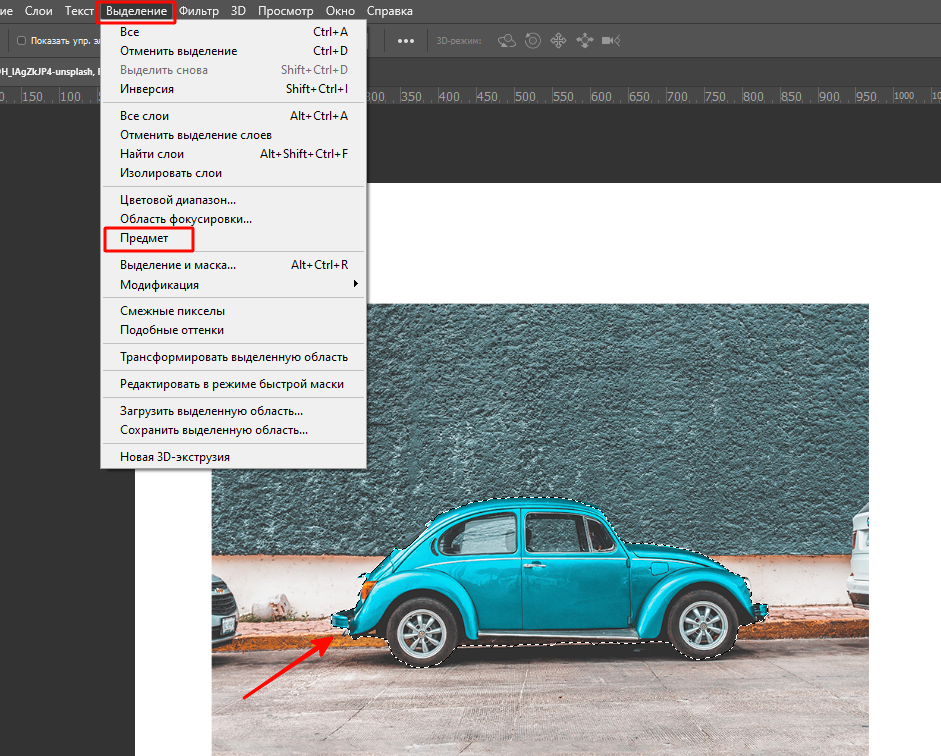 Чтобы просто удалить фон, можно воспользоваться любым инструментом выделения в Photoshop, а затем полностью стереть всё, что не относится к выделенному объекту. Например, чтобы выделить автомобиль на примере ниже, мы применили автоматическое выделение предмета. В данном режиме Photoshop сам определяет объект на фото и выделяет его, создавая пунктирную рамку вокруг.
